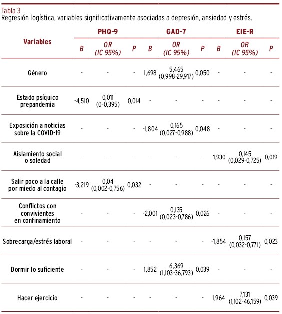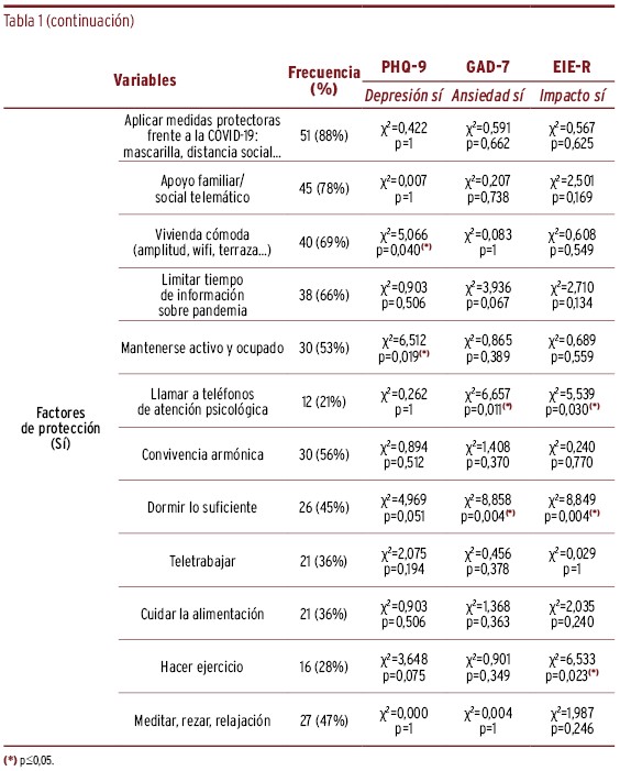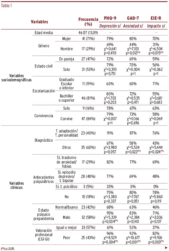 MÉTODOS // Se realizó un estudio observacional transversal en una muestra de cincuenta y ocho pacientes mediante un cuestionario que recogía diferentes variables descriptivas. Se administraron la Escala de Depresión PHQ-9, la Escala de Ansiedad GAD-7, la Escala Revisada de Impacto del Estresor EIE-R, la Escala de Impresión Clínica Global CGI-GI y la valoración de los facultativos responsables de los pacientes sobre el estado clínico de los pacientes. Se realizó un análisis descriptivo y se aplicaron modelos de regresión logística binaria.