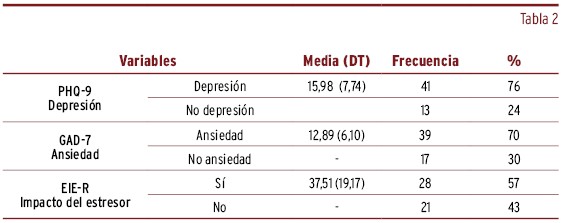 RESULTADOS // Hubo una prevalencia de 70% de ansiedad, 76% de depresión y 57% de estrés por evento estresante más de un año después de iniciarse la pandemia. Asimismo, se encontró asociación de los síntomas clínicos con determinadas variables clínicas, con variables mediadoras y con el género.