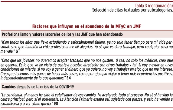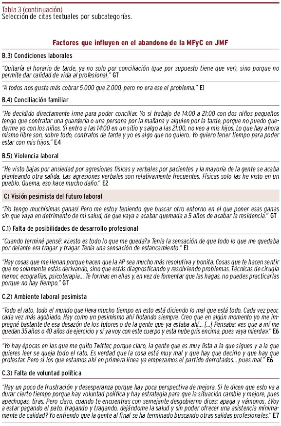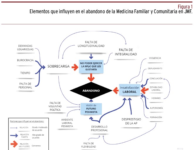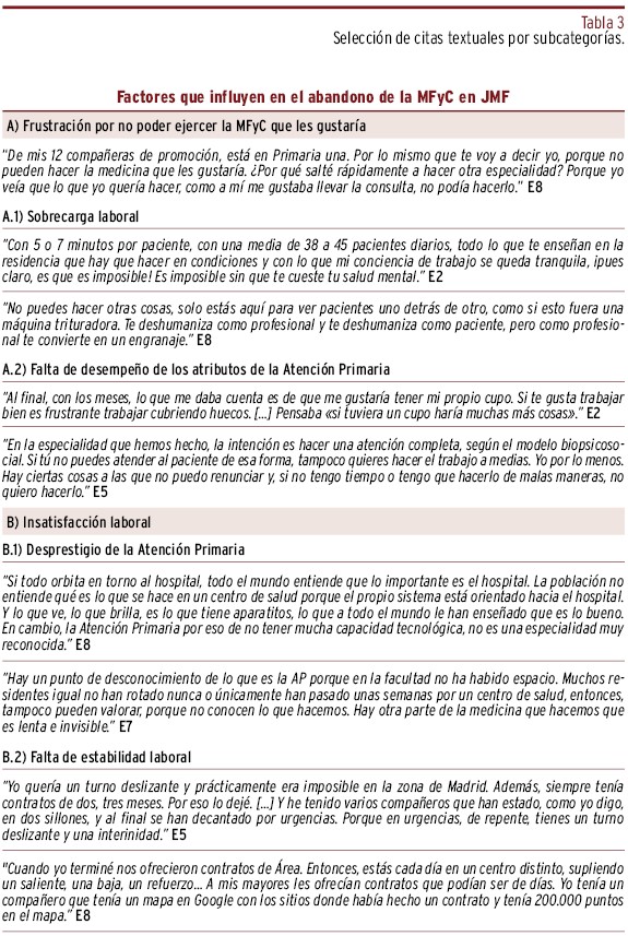 RESULTADOS // Los jóvenes médicos y médicas de familia abandonaban la Medicina Familiar y Comunitaria por la frustración de no poder ejercer como les gustaría, por insatisfacción laboral y por una visión pesimista de su futuro como trabajadores/as. La decisión de abandonar de estos jóvenes profesionales se vio favorecido por el empeoramiento de las condiciones laborales tras la pandemia y sus valores respecto al trabajo.