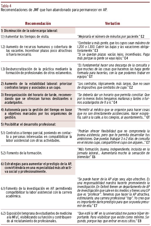 CONCLUSIONES // La decisión de jóvenes médicos y médicas de familia de abandonar la Medicina Familiar y Comunitaria es compleja. Para contribuir a su permanencia es necesario mejorar sus condiciones laborales y represtigiar la especialidad.