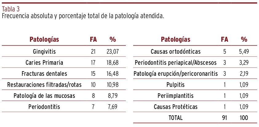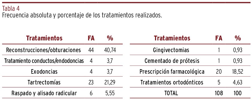 RESULTADOS // Se atendieron un total de 70 pacientes por problemas bucodentales, donde la gingivitis y la caries fueron las enfermedades que más incidencia presentaron, con un 23,07% y un 18,68%, respectivamente. Los tratamientos más realizados fueron las reconstrucciones/obturaciones dentales con un 40% y las tartrectomías con un 21% del total.