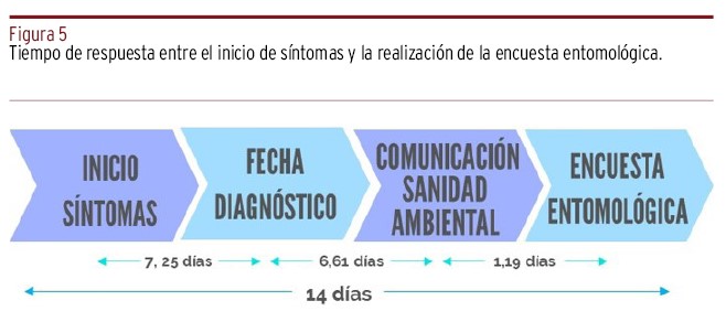 RESULTADOS // Se ha corroborado la presencia de poblaciones establecidas de mosquito tigre en un total de 273 municipios durante el periodo de estudio, aumentando el número de localidades afectadas a finales de 2021 a 464 del total de 542 que componen la CV. Se evaluó el tiempo de respuesta transcurrido desde el inicio de la sintomatología hasta realizarse el diagnóstico, el tiempo acontecido desde la diagnosis hasta su información a la Unidad de Sanidad Ambiental correspondiente y la realización de la encuesta entomológica.
