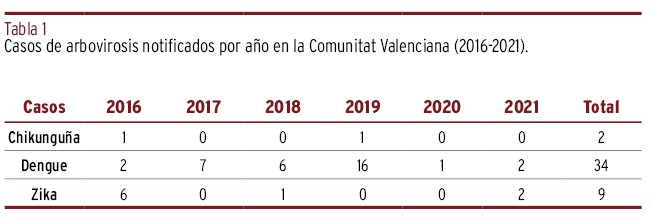 FUNDAMENTOS // Durante los últimos años, las arbovirosis están adquiriendo importancia en Europa debido a brotes autóctonos de enfermedades emergentes y reemergentes como la fiebre por virus chikunguña, dengue y Zika. Estas virosis representan una amenaza en zonas templadas como la Comunitat Valenciana (CV), donde la presencia de su vector, el mosquito tigre asiático, presenta una amplia distribución. El objetivo de este trabajo fue informar sobre las actuaciones llevadas a cabo dentro del Programa de la CV en la gestión de los casos declarados de arbovirosis importados desde 2016 a 2021.