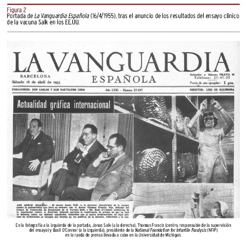 Manifestaciones del director general de Sanidad sobre la vacuna Salk. La Vanguardia Española, 16/04/1955.