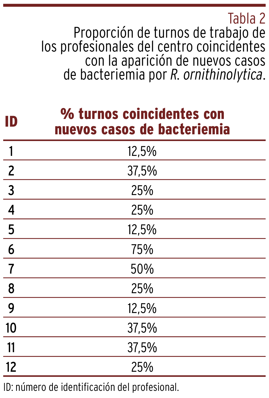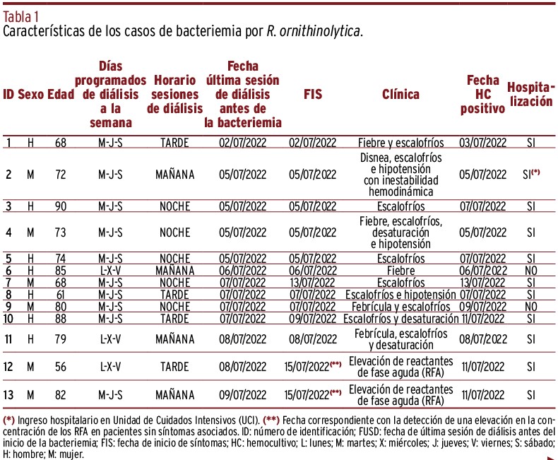 MÉTODOS // Se realizó un estudio de una serie de trece casos con hemocultivo positivo para Raoultella ornithinolytica durante julio de 2022. Se plantearon dos hipótesis: transmisión directa a través de la contaminación del producto antiséptico o transmisión cruzada a través de las manos del personal sanitario del centro. Se llevó a cabo un análisis descriptivo de los datos y se calcularon tasas de ataque y riesgo atribuible en expuestos (portadores de CVC).