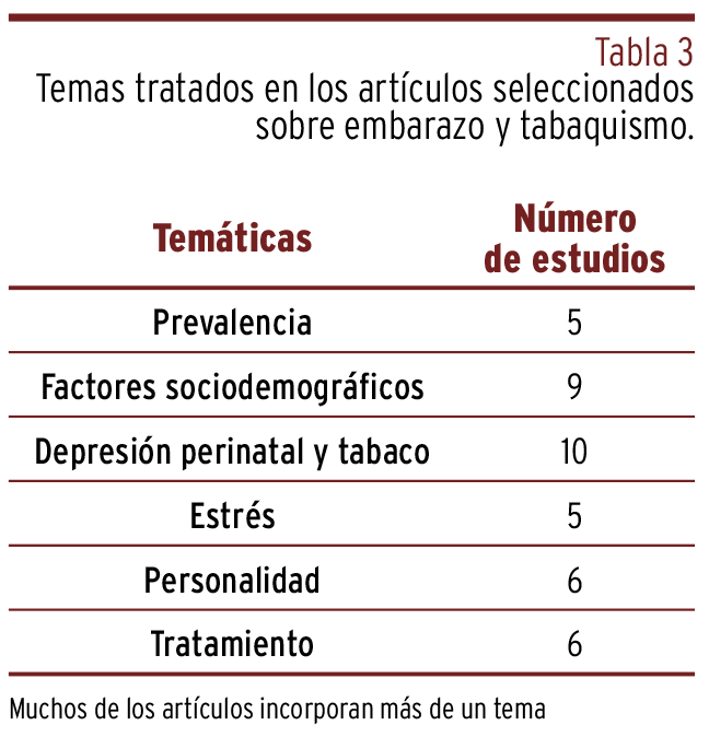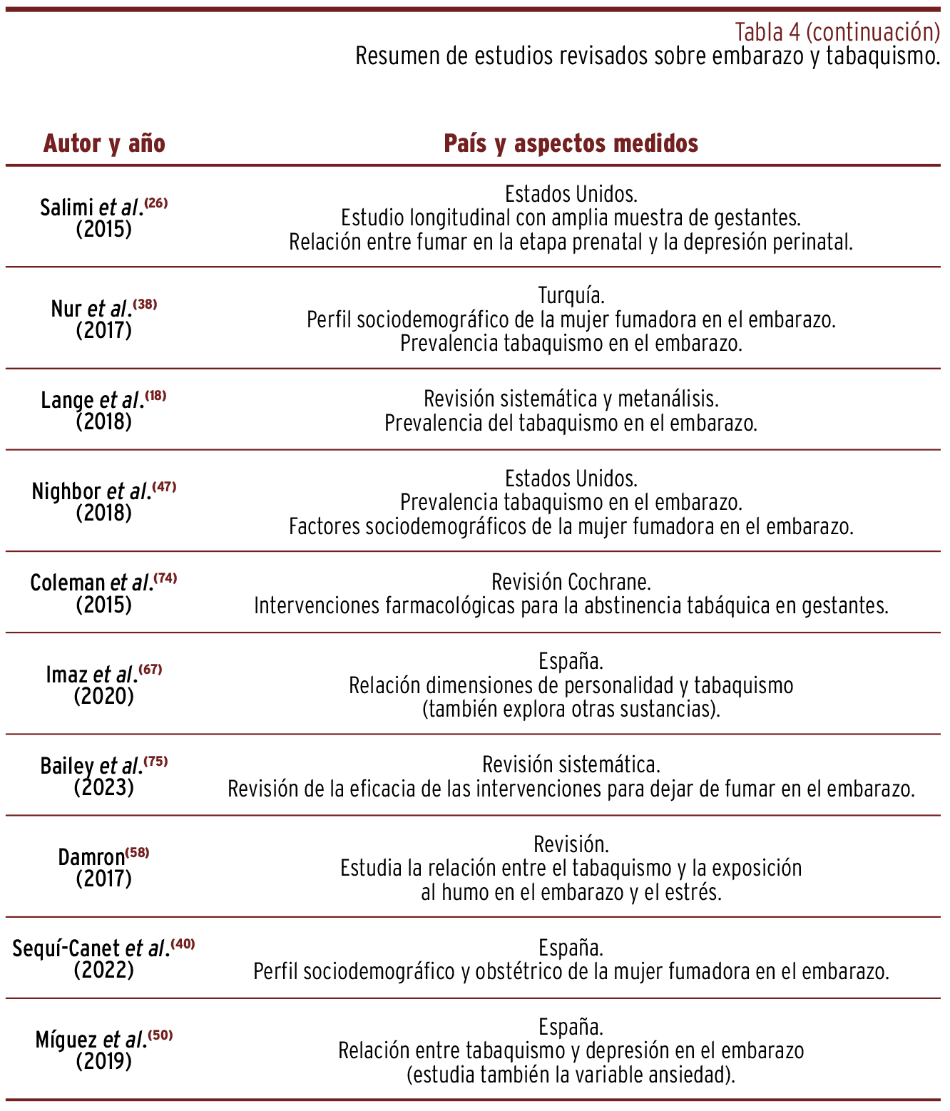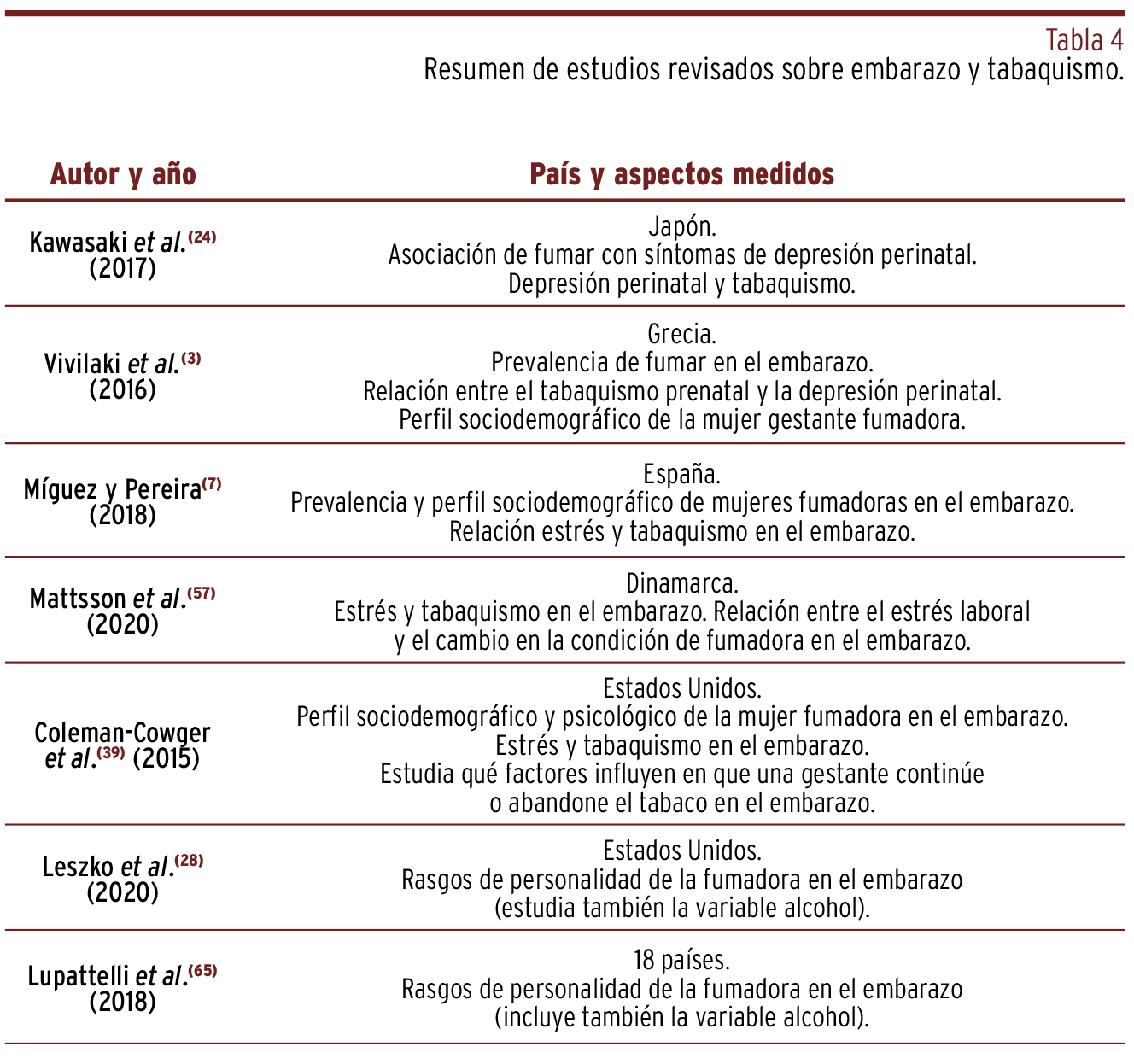 RESULTADOS // La prevalencia del tabaquismo en el embarazo se sitúa en un 15,7% en España. El perfil sociodemográfico de la mujer fumadora en el embarazo es de aquella con bajo nivel socioeconómico y educativo, generalmente sin pareja o con parejas fumadoras, y sin trabajo. Se encontró relación entre fumar en el embarazo y mayor probabilidad de padecer depresión perinatal. Un alto estrés autopercibido es posible que sea una variable predictora de continuar fumando en el embarazo. Algunos rasgos de personalidad como elevado neuroticismo parecen estar relacionados con el tabaquismo en el embarazo. La intervención para ayudar a dejar de fumar a las embarazadas debe adaptarse al perfil de la misma para que sea eficaz. Las intervenciones cognitivo-conductuales muestran su eficacia, especialmente a largo plazo.