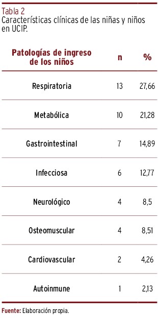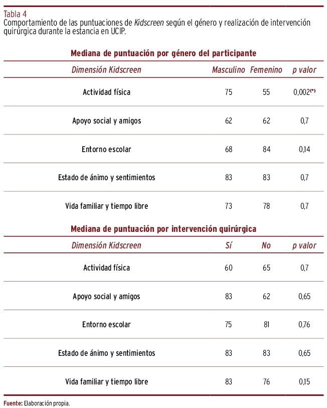 RESULTADOS // Los resultados mostraron diferencias estadísticas significativas en calidad de vida entre géneros con un valor de P=0,002, con menores puntuaciones en actividad física en niñas. Además, las patologías respiratorias fueron la principal causa de ingreso a UCIP con un 27,6%, destacando la importancia del apoyo familiar y social. Por último, el 89,9% de los niños fueron sometidos a procedimientos de inserción de catéteres y sondas.