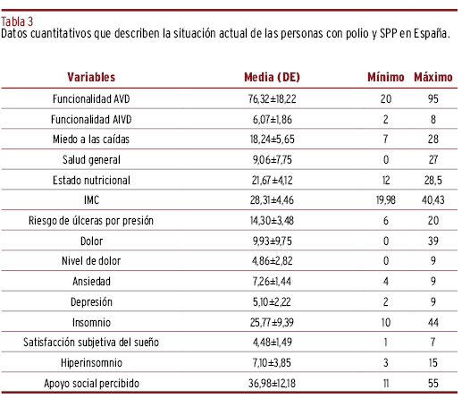 MÉTODOS // Se llevó a cabo un estudio transversal descriptivo con una muestra de ochenta y siete personas procedentes de diversas asociaciones contra la polio en España. La recolección de datos se realizó mediante cuestionarios autoadministrados. Se aplicaron análisis estadísticos descriptivos para interpretar los datos.