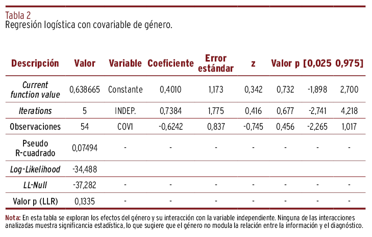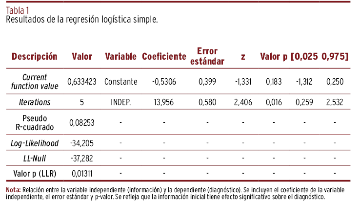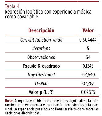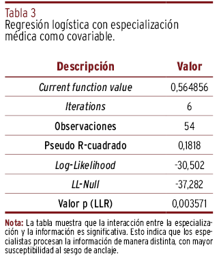 RESULTADOS // El análisis reveló una relación significativa entre la información proporcionada y el diagnóstico final (p<0,05), con un pseudo R-cuadrado de 0,0825. La especialización mostró una interacción significativa con la variable independiente (p=0,009), sugiriendo que los especialistas fueron más propensos al sesgo de anclaje que los generalistas. No se halló efecto modulador del género ni de la experiencia.