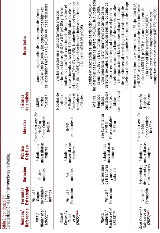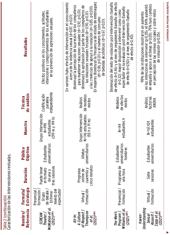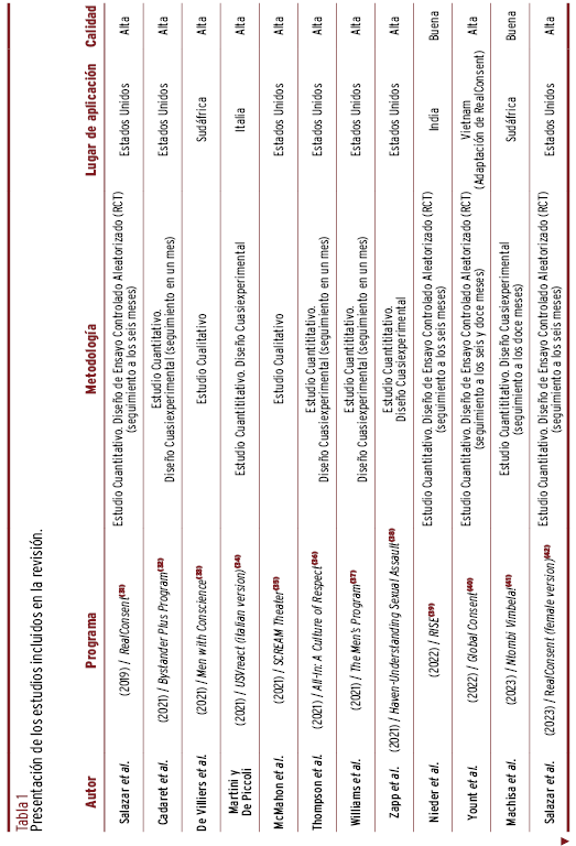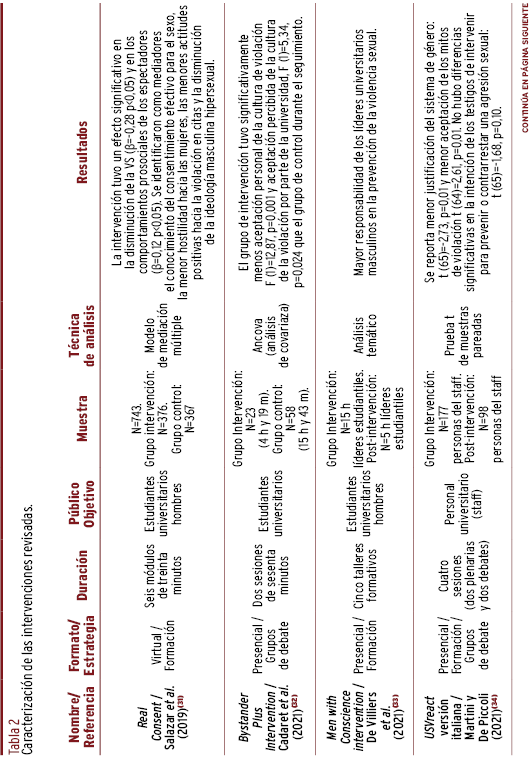 RESULTADOS // Los programas preventivos se concentraron en el norte global. Las intervenciones se dirigieron a los estudiantes, focalizadas por sexo. Se orientaron a la prevención de la violencia sexual por medio de la promoción de comportamientos prosociales de los espectadores y de la empatía hacia las víctimas, fundamentados en los preceptos de la cognición y las normas sociales. El formato empleado fue de estrategias formativas virtuales, con resultados positivos en el desmontaje de creencias erróneas y cambios actitudinales con relación a los estereotipos de género.