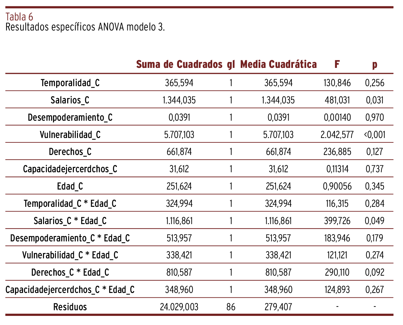 CONCLUSIONES // La precariedad laboral afecta negativamente a la salud mental de los trabajadores. Dimensiones específicas como los salarios y la vulnerabilidad tienen un impacto significativo. La precariedad salarial afecta más a los jóvenes, sugiriendo que la edad modera este impacto, siendo la salud mental de los jóvenes más vulnerable a la precariedad salarial.
