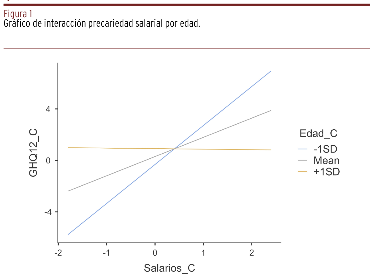 RESULTADOS // Se encontraron correlaciones estadísticas significativas entre la salud mental y diversas dimensiones de la precariedad laboral: salarios (r=0,444); vulnerabilidad (r=0,530); derechos (r=0,307); y capacidad para ejercer derechos (r=0,340). La precariedad global se correlacionó con problemas de salud mental (r=0,429), pero no se encontraron diferencias en función de la edad, afectando a la salud mental del mismo modo a cualquier edad. La edad mostró una correlación negativa con la precariedad global (r=-0,389), pero no con la salud mental. Solo los salarios (f=4,810) y la vulnerabilidad (f=20,425) mostraron capacidad explicativa. La interacción entre salarios y edad fue significativa (f=3,997). El impacto de la precariedad salarial sobre la salud mental fue mayor en los jóvenes y casi inexistente en los mayores.